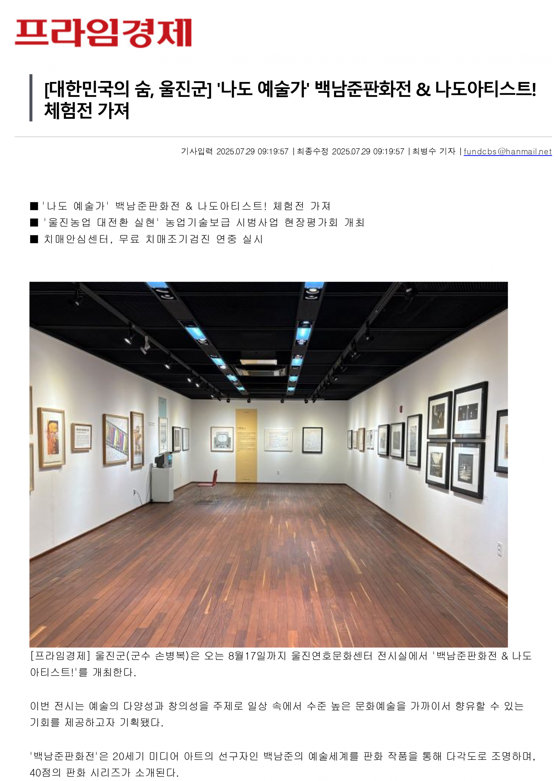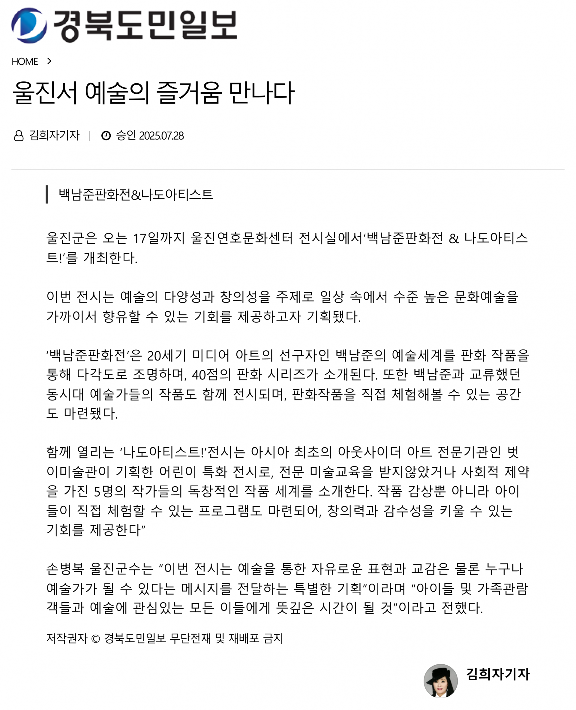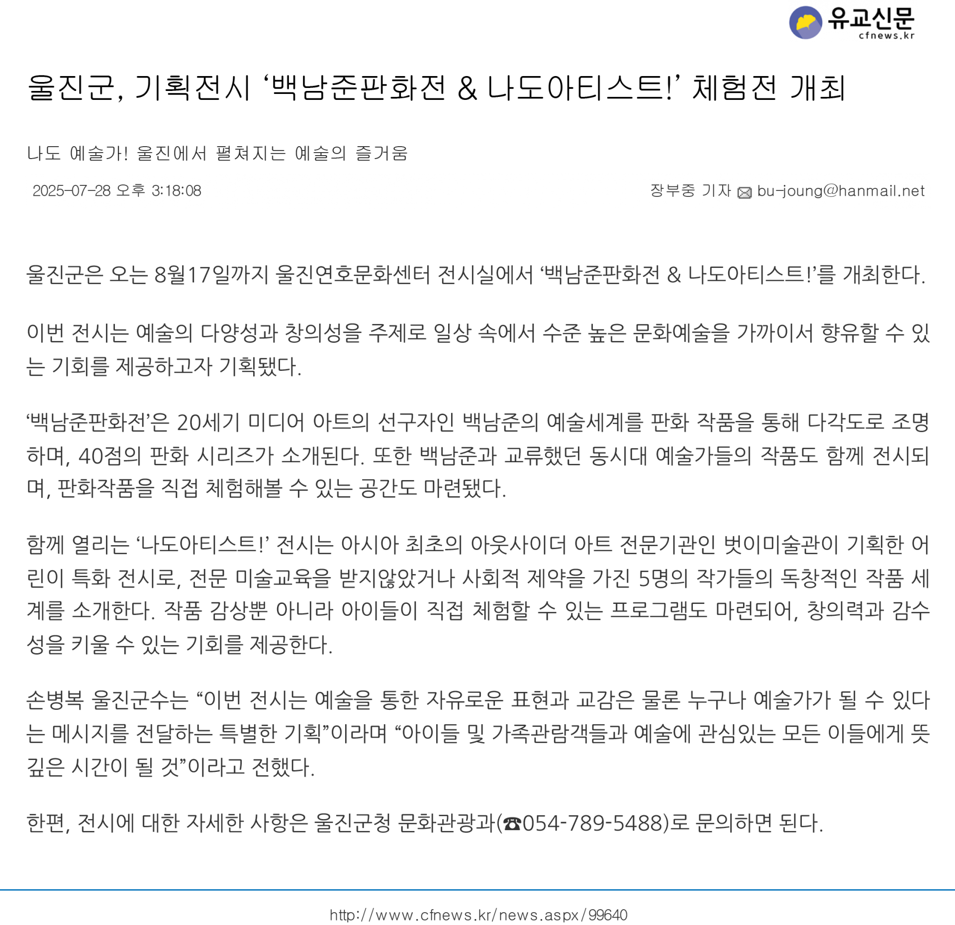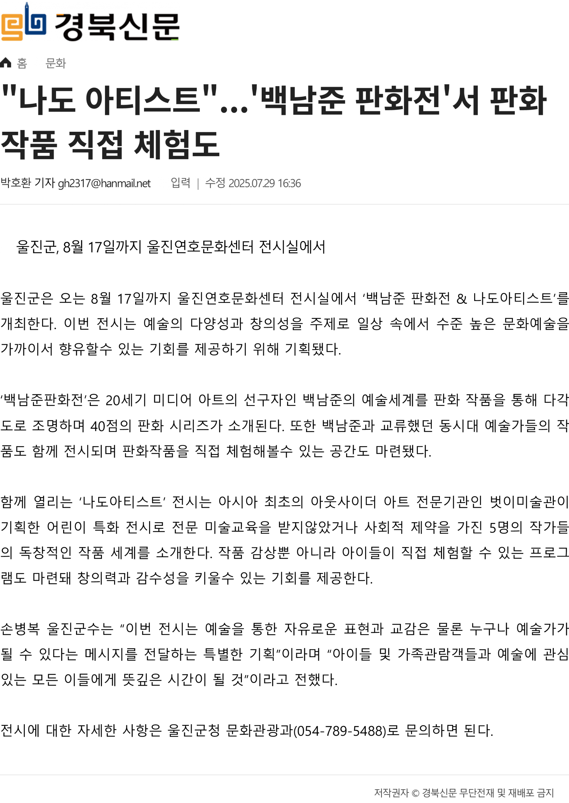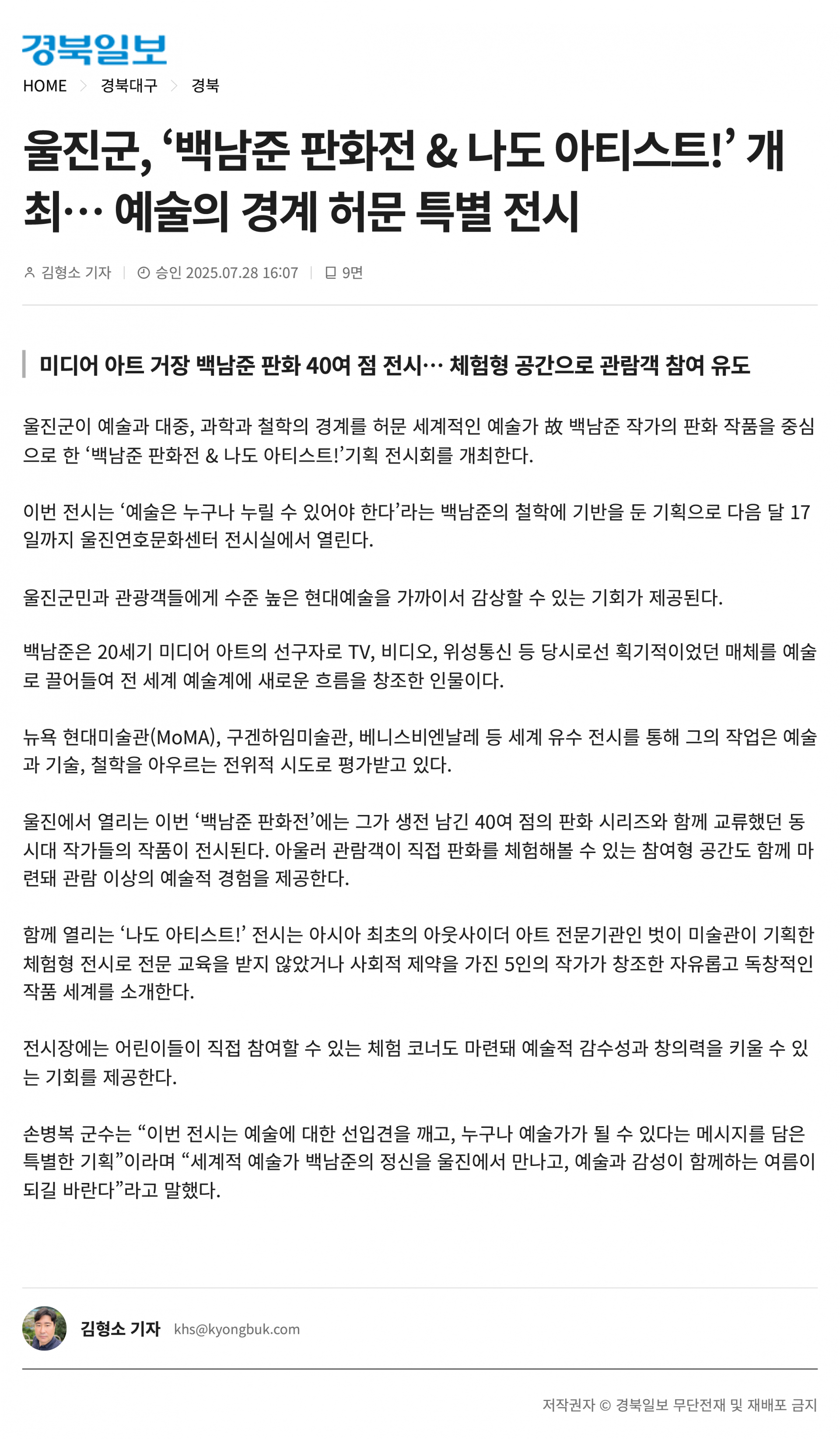 손병복 군수는 “이번 전시는 예술에 대한 선입견을 깨고, 누구나 예술가가 될 수 있다는 메시지를 담은 특별한 기획”이라며 “세계적 예술가 백남준의 정신을 울진에서 만나고, 예술과 감성이 함께하는 여름이 되길 바란다”라고 말했다.